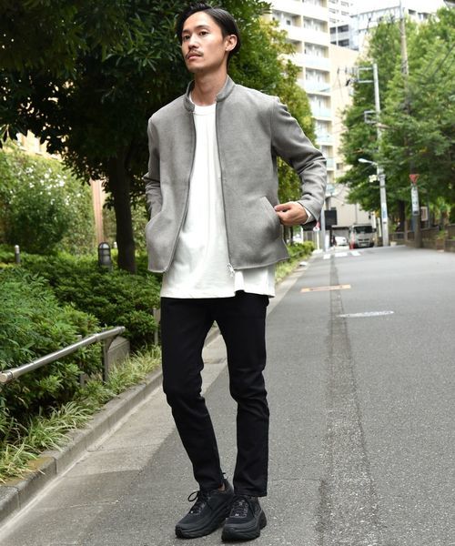 ストレッチの効いたのフェイクスエード素材のジャケットは、身体にフィットしてどんな動きにも馴染みやすいですよ。アクティブに行動したい休日コーデにもぴったりですね。