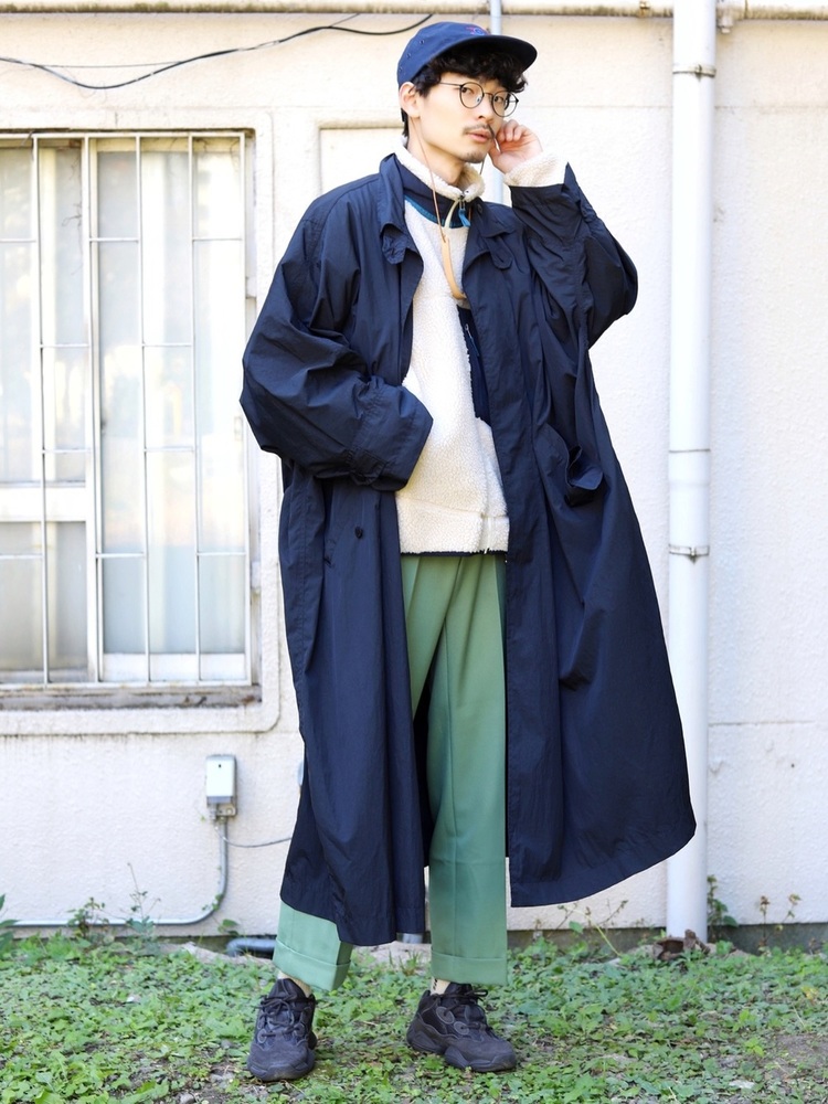 ボアジャケットをミドルレイヤーとしてロングコートをオーバーサイズで着ることで野暮ったさが全くないスタイリッシュな着こなしです。ボアジャケットを閉めて着ることにより、タートルネックのようになりロングコートとマッチしていますね。