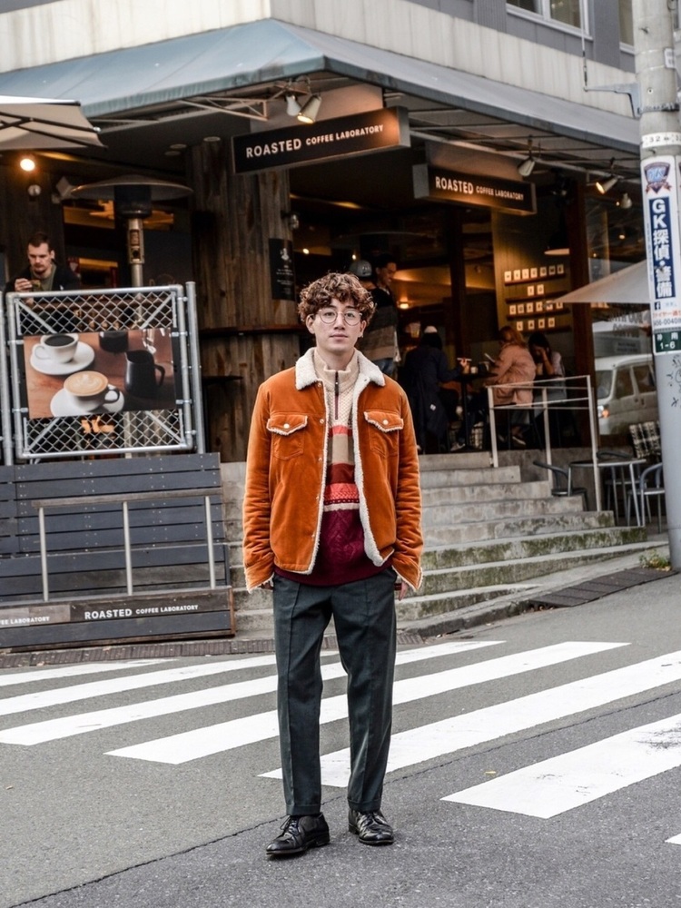 コーデュロイボアジャケットにグレーのスラックスパンツを合わせたメンズコーデ。キレイめカジュアルスタイルですが、ボアジャケットの色味と襟がボア素材なのでやわらかな雰囲気の演出ができていますね。