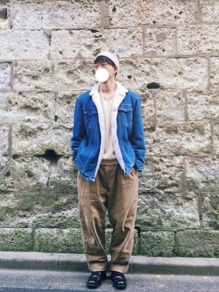 アメカジスタイルに古着MIXコーデ。デニムの色味が古着ならではでかっこいいですね。全体的にゆったりとしたサイズ感と淡い色味でナチュラルな着こなしになります。
