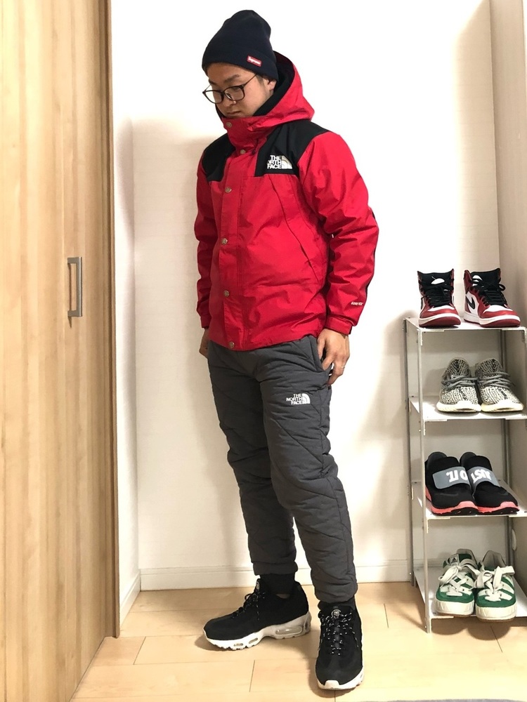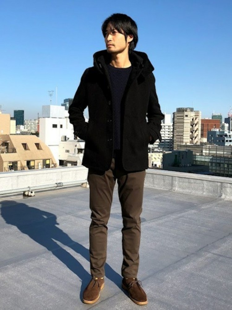暖パンにはシルエットやカラーが種類豊富なので、私服としてコーディネートを楽しむことができます。このコーディネートはブラックとカーキ色で統一感を演出したメンズコーデで、暖パンとシューズを同じ色味にしていることが特徴。すっきりしたシルエットの暖パンを選ぶことで大人っぽい雰囲気に仕上げることができます。