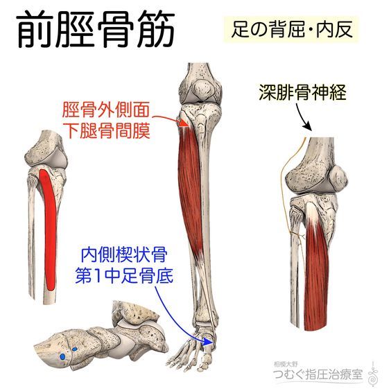 前脛骨筋(ぜんけいこつきん)とは、脛骨から足の裏の内側までを繋いでいる筋肉で、足首を反らす運動などで働きます。