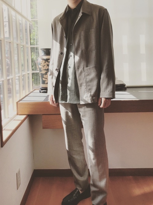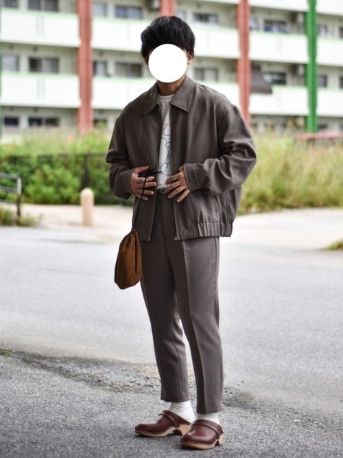 セットアップにサボサンダルを合わせた、メンズコーデです。くすんだカラーのセットアップがトレンドを抑えたアイテムになっており、ゆったりしたデザインのブルゾンがきれいめな印象を与える着こなしになっています。サボサンダルを合わせる事で、ラフな雰囲気も加わりおしゃれです。
