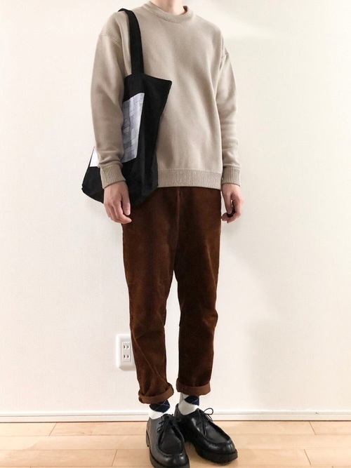 ニットとデッキシューズを合わせた、シンプルなメンズコーデです。アイテムを暖色系でまとめることで、シックな印象のデッキシューズを引き立たせています。またニットとコーデュロイという温かみのある素材にする事で、着ている方優しく大人な印象にしてくれる着こなしになっています。ベストをプラスすると、より大人な雰囲気になります。
