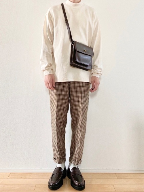 ローファーに合わせてショルダーバッグも黒にすることで、スタイル全体を引き締めています。またチェックパンツをロールアップにしているので、カジュアルな印象も加わりおしゃれです。