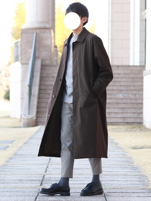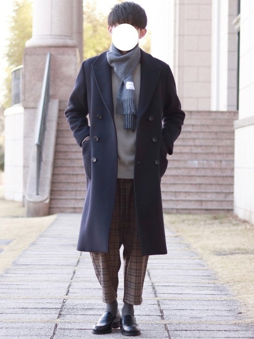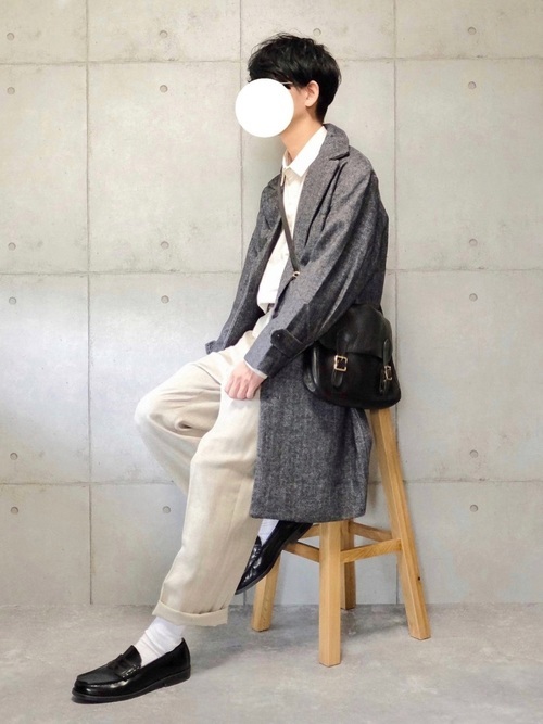 チェスターコートとローファーを合わせた、きれい目なメンズカジュアルコーデです。アウターのチェスターコート以外を対象的な明るいカラーでまとめることで、コートが映えたスタイルになっています。