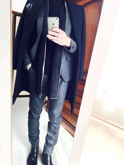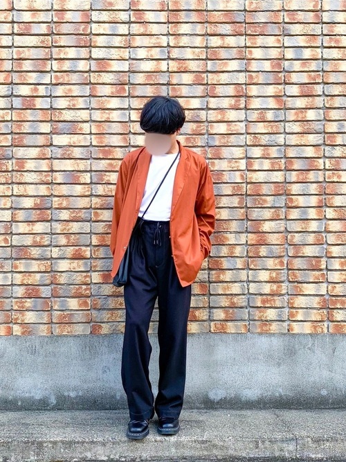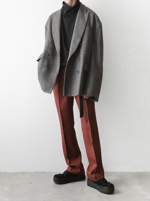 ブーツを合わせる事で、きれい目なテイストになっています。またテーラードジャケットとスラックスの素材を合わせる事で、スーツのようなスタイルになります。シーンを問わないファッションですので、おすすめです。