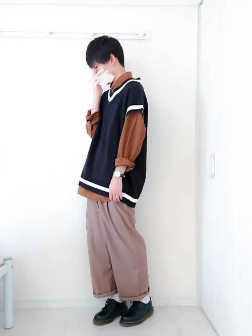 また濃い色味のワイドシャツにする事でゆったりし過ぎず、重ね着しているベストが合った着こなしになっています。伊達メガネをプラスすると、知的な印象が合わさりよりおしゃれになります。