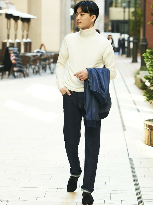 ホワイト系タートルネックニット×ブルー系デニムパンツ