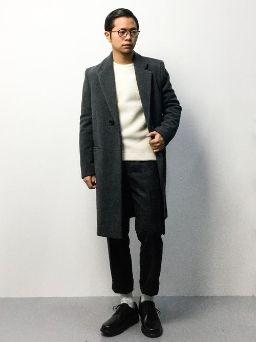 ホワイト系クルーネックニット×グレー系チェスターコート