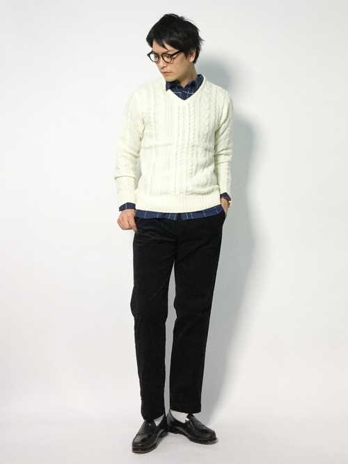 ホワイト系ケーブルニットにブルー系ネルシャツを合わせた、かっちりしすぎない、キレイめコーデ。白ニットにシャツ、レザーシューズと品の良いイメージのアイテムを使いつつも、シャツにチェック柄、パンツにイージーパンツを使い、適度にカジュアルダウンしています。