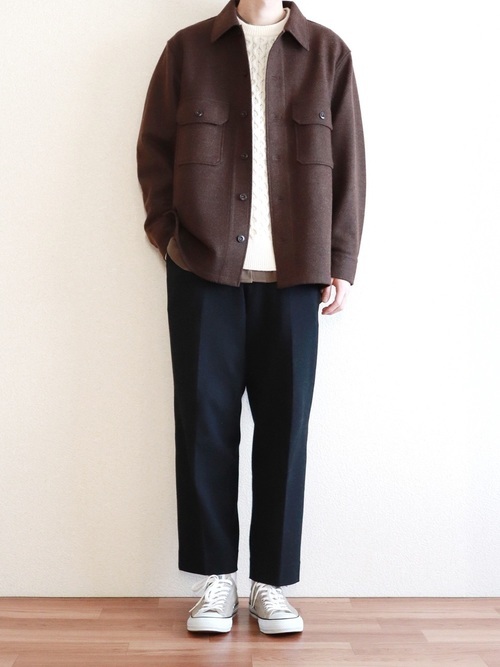 白ニットのアウターにブラウン系のシャツジャケットを使った秋冬におすすめのメンズコーデ。ニットとスニーカーを白で統一することで、爽やかな印象になっていますね。こちらのメンズコーデのように、ケーブルニットを使って暖かみを演出しても良いですし、ハイゲージニットで上品さを出しても良いでしょう。