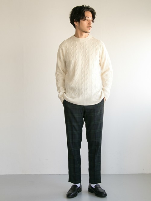 白ニットとスラックスというシンプルなメンズコーデ。しかし地味という感じにならないのは、ケーブルニットのおかげです。ニットにしっかりと表情があり、コーデに柔らかな印象を与えています。