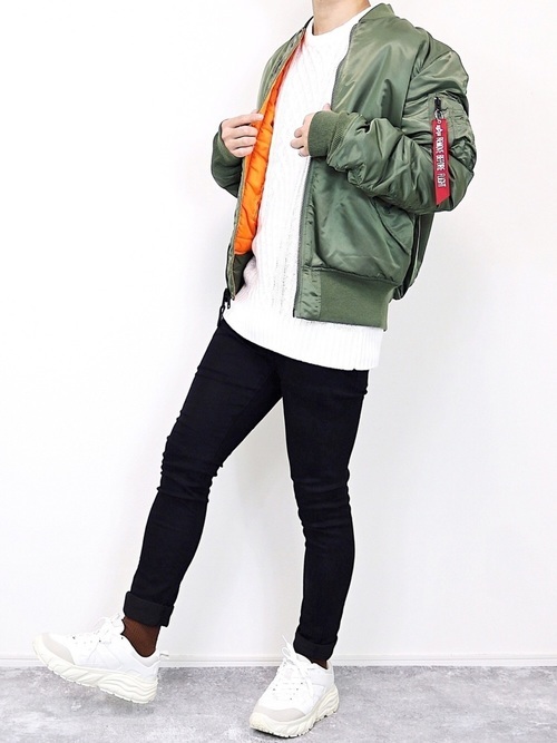 ホワイト系ケーブルニット×カーキ系MA-1ジャケット