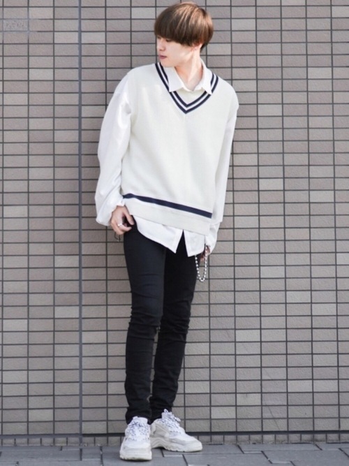 ホワイト系チルデンニットにホワイト系シャツを合わせた上半身と、ダークトーンのパンツで作ったモノトーンメンズコーデ。チルデンニットのVネックラインのおかげで、単調な印象になっていません。Vネック周りの柄はシンプルなコーデのときに、生きてきます。
