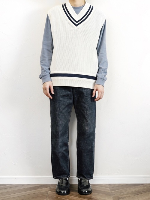 Vネックを活かしレイヤードスタイルを楽しめるのもチルデンニットの良いところですね。
