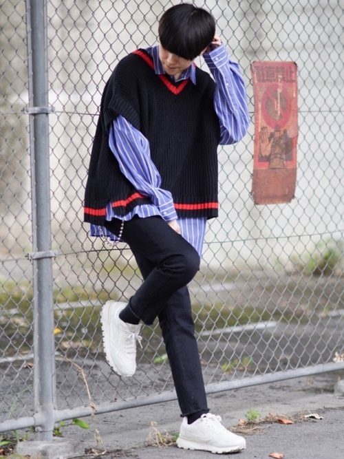 白ニットにシャツという定番の組み合わせもチルデンニットを使えば、プレッピーな印象に変わります。Vネックで開いた首元をシャツで埋めることで真面目な印象をアピールできます。またVネックの周りの赤いラインがアクセントになっていますね。