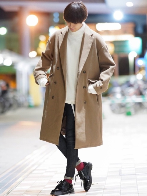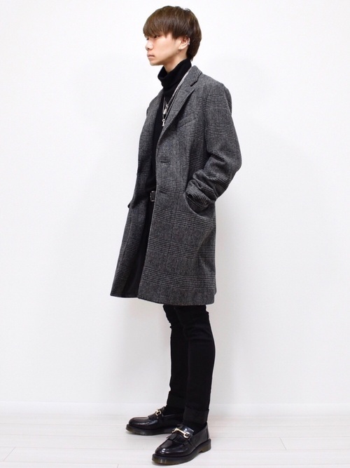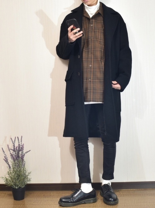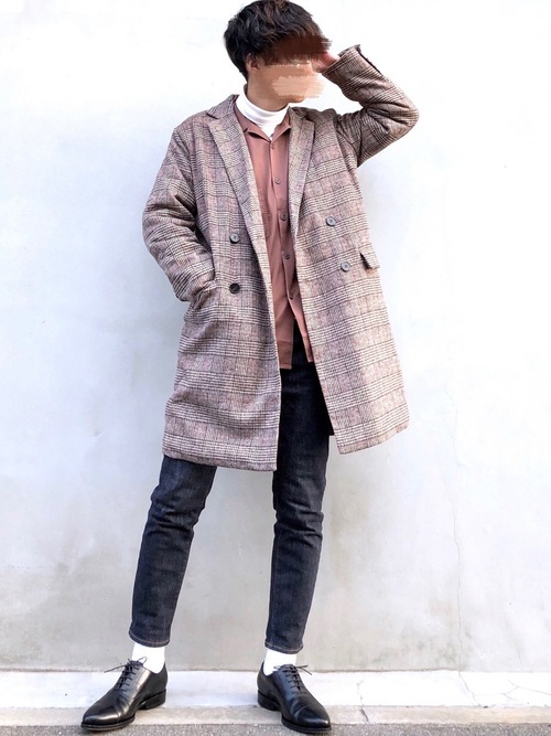 ベージュのチェック柄チェスターコート×ブラックデニムのジーンズの、あたたかみを感じさせるコーディネート。ダブルのチェスターコートなので、適度なボリューム感とスキニージーンズがグッドバランス。インナーのタートルネックTとオープンカラーシャツのコーディネートは、チェスターコートとの相性がよくこなれて見えます。