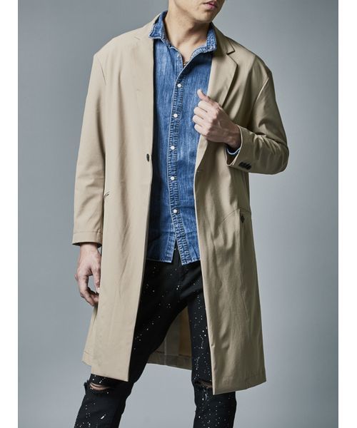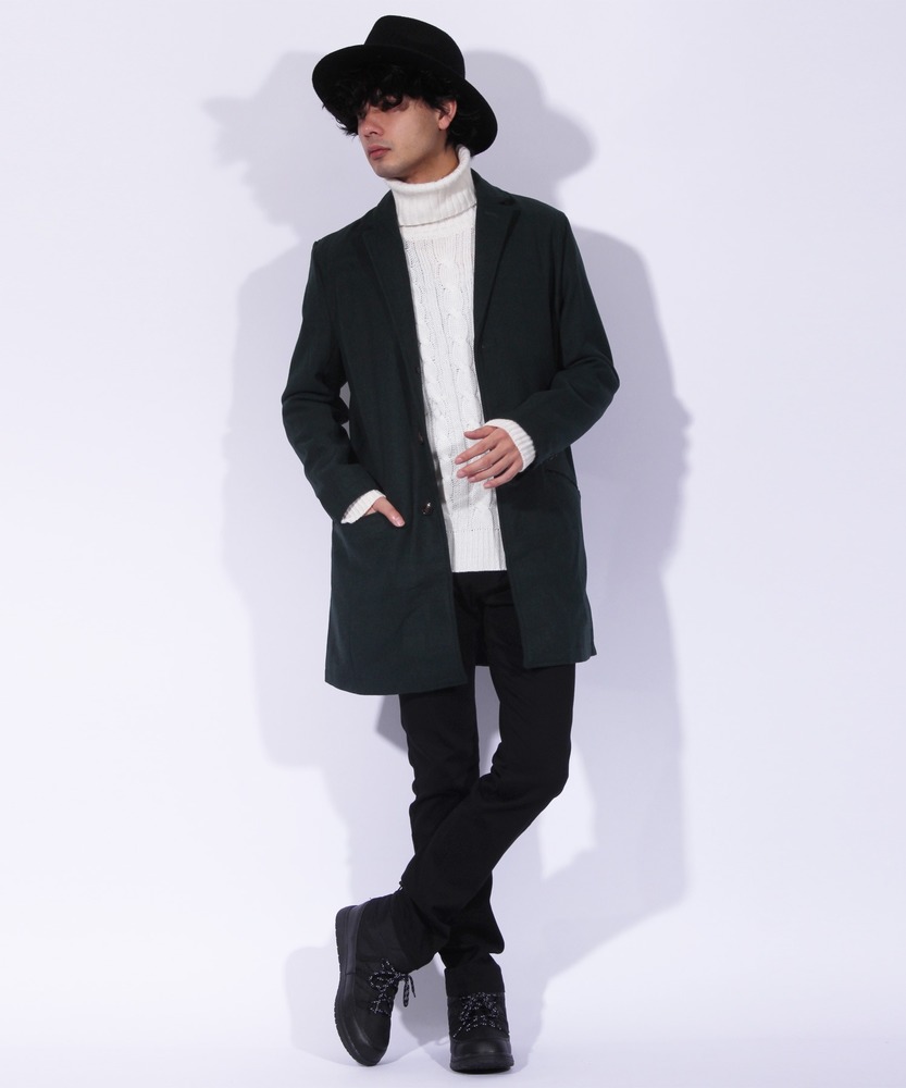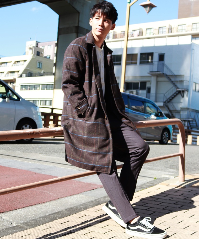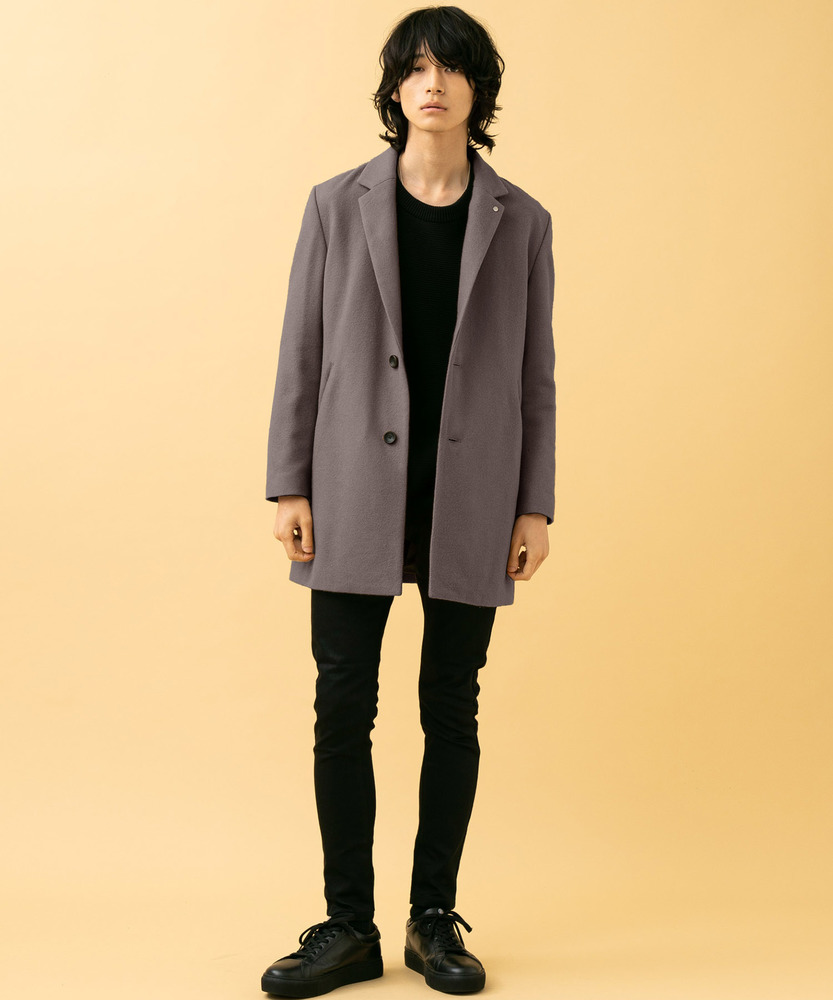 ややロング丈のスリムなチェスターコートが縦のラインを強調し、シンプルなコーディネートをすっきりと見せてくれます。