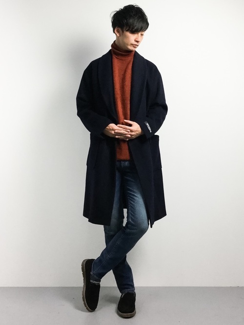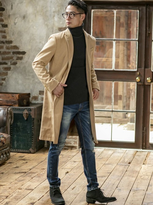 チェスターコート×ジーンズ×タートルネックT×シャツ