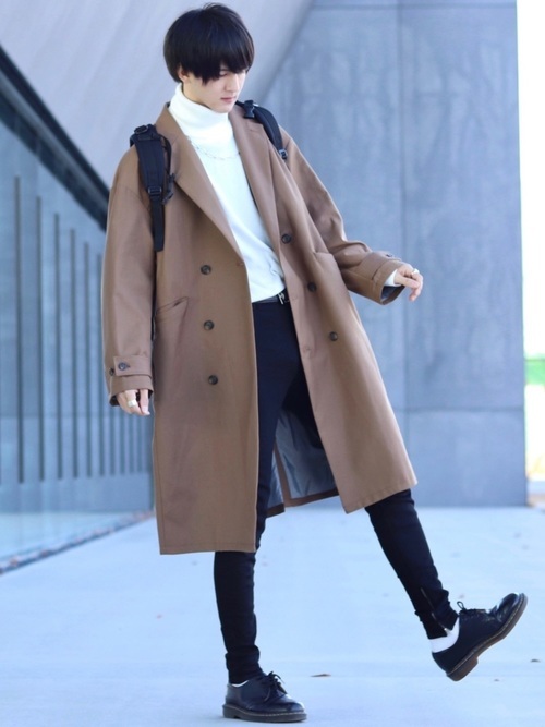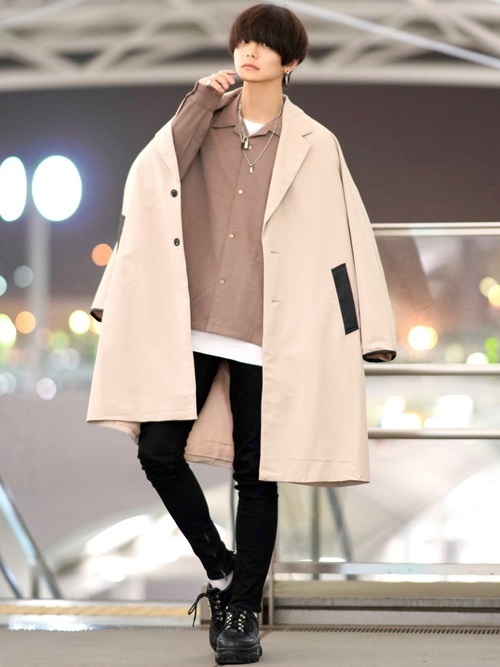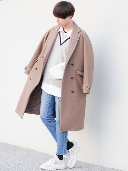 ベージュのチェスターコート×ブラックデニムのジーンズに、トーンちがいのベージュのオープンカラーシャツをコーディネート。チェスターコートのベージュよりもシャツを一段濃いベージュに、レイヤードのクルーネックTのホワイトを襟元と裾から見せることで、絶妙なグラデーションに。