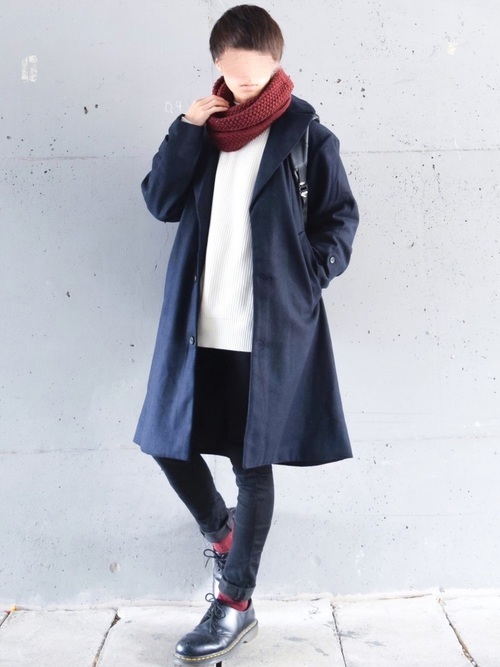 ネイビーのチェスターコート×ブラックデニムのジーンズ、ホワイトのカットソーにボルドーがポイントのシックなコーディネート。ひざ丈のチェスターコートとホワイトニットの分量のバランスが絶妙、さらにスヌードと靴下の差し色のボルドーが効果大。配色バランスで、学生風になりやすいチェスターコート×リュックのコーディネートを格上げしています。