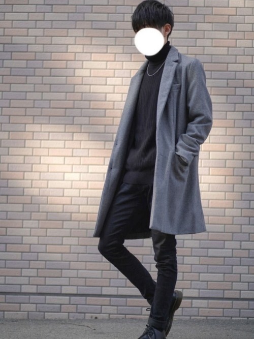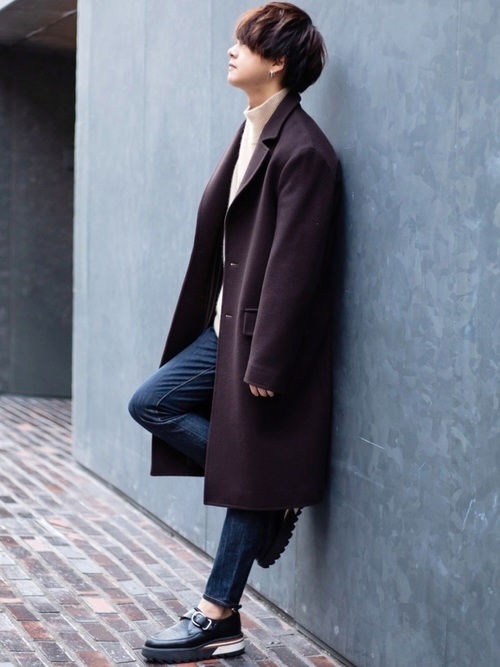 ダークブラウンのチェスターコート×ブラックデニムのジーンズに、グレーのタートルニットのシックなコーディネート。