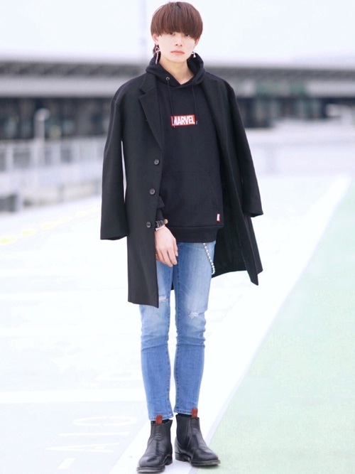 チャコールグレーのチェスターコート×ブラックデニムのジーンズに、スウェットをインナーにしたリラックスコーディネート。