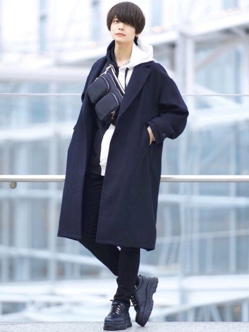 ネイビーのビッグサイズチェスターコート×ブラックデニムのジーンズに、白黒バイカラーパーカーのクールなコーディネート。