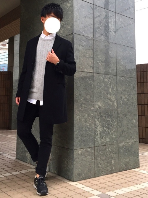 インナーにシャツとクルーネックのケーブルニット、そこにスリムなチェスターコートをジャケット感覚で羽織れば、かっちりとした印象に。