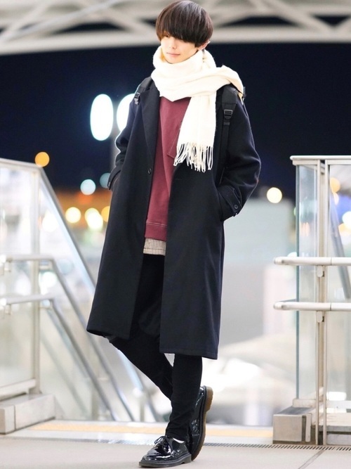 ネイビーのオーバーサイズチェスターコート×ブラックデニムのジーンズに、ボルドーのスウェットをポイントにした冬向きコーディネート。ネイビーとボルドー、裾から見えるグレー系の細かなハウンドトゥース(千鳥格子)シャツの配色が個性的。重くなりやすいコーディネートに、ホワイトのマフラーで抜けを作り、視線を上げてスタイルアップも叶えています。