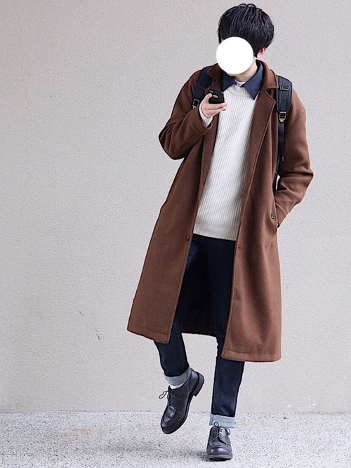 ブラウンのチェスターコート×ウォッシュブルージーンズに、襟のブルーをリンクさせたきれいめなコーディネート。