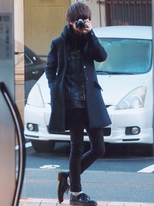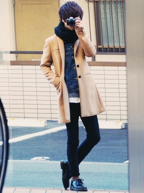 キャメルのチェスターコート×ブラックデニムのジーンズに、レイヤードTとジージャンのきれいめカジュアルコーディネート。濃いネイビーのスヌードからジージャン、レイヤードTのカラーグラデーションを、ブラックジーンズで引き締め、靴下のマルチカラーとキャメルのチェスターコートをリンクさせて全身のカラーリングをまとめています。