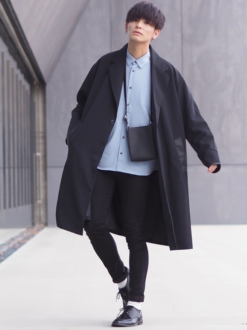 オーバーサイズのブラックチェスターコート×ブラックデニムのジーンズに、爽やかなスカイブルーのシャツをインナーにした春向きコーディネート。薄手素材のチェスターコートが新鮮、さらっと羽織れるので、全身ブラックでも重く見えません。インナーに明るいカラーのシャツを選ぶとより軽やかな着こなしになります。