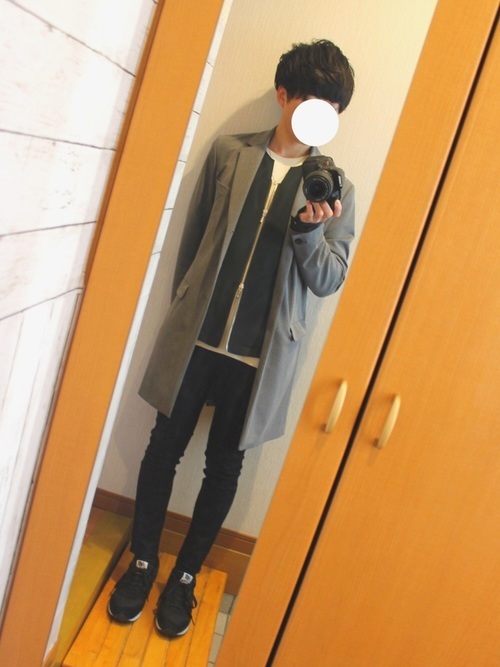 グレーのチェスターコート×ブラックデニムのジーンズの、グレーグラデーションコーディネート。