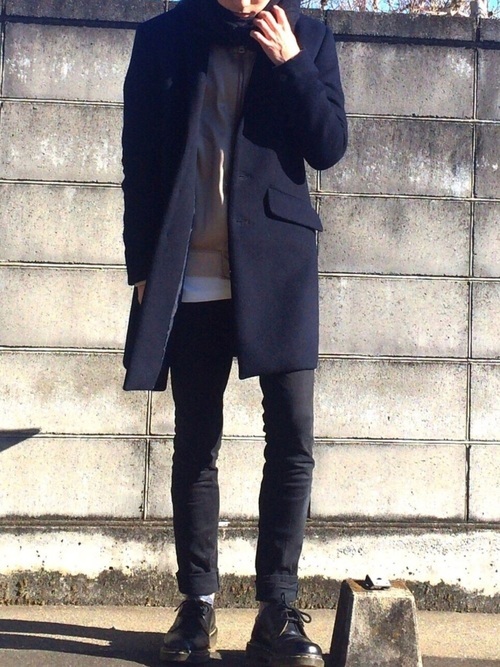 ネイビーのチェスターコート×ブラックデニムのジーンズに、スリムなジージャンとニットをインナーにした、オールネイビーコーディネート。