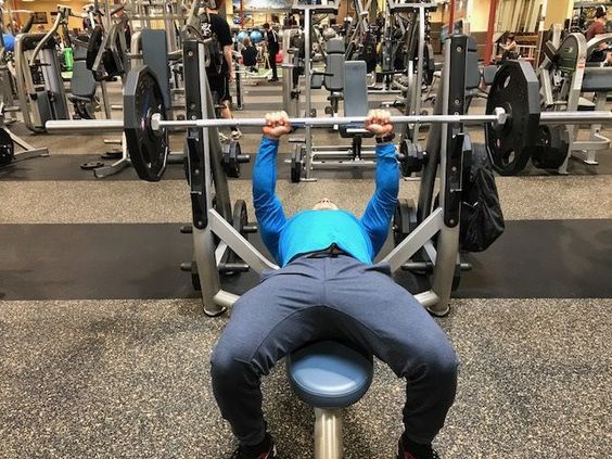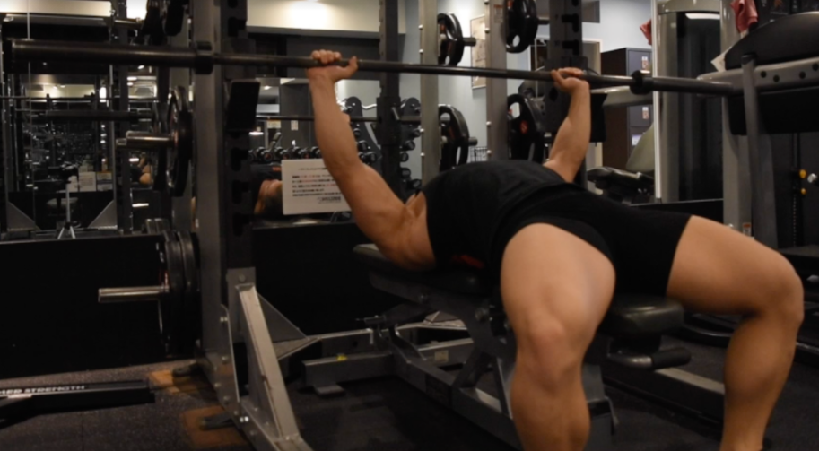 グリップ幅の狭いクローズグリップベンチプレスではブリッジを作っても可動域が狭くなるだけで逆効果になってしまいます。そのため、肩甲骨の下に手の平が入るくらいの自然なブリッジで構いません。