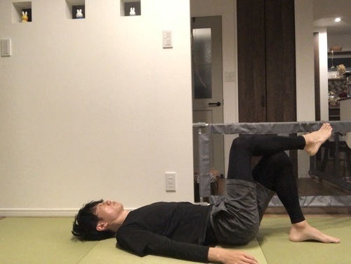 身体が固くなっていると、仰向けになれないこともありますよね。その場合は身体を起こした状態でストレッチを行ってください。刺激に慣れてくると仰向けの状態でもできるようになります。さらに負荷をかける場合は足首を曲げると良いでしょう。