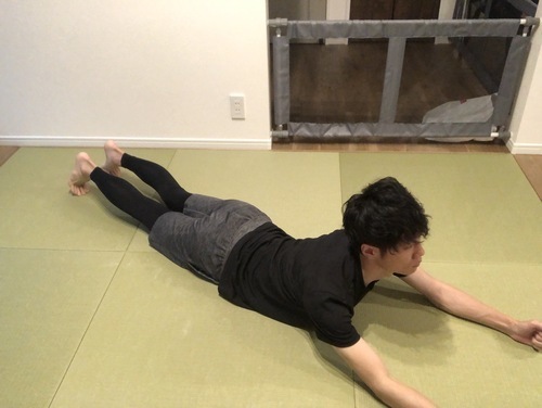 このストレッチでは、胸や背中が伸びるかは疑問ですが、お腹がメインになります。ただし腰が痛い方は注意しながら行いましょう!