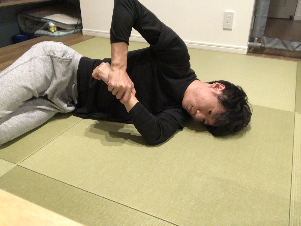寝ながら肩関節のストレッチする方法です。別名、スリーパーストレッチともいいます。肩の後ろぐらいから三角筋のあたりに効果がありますよ。