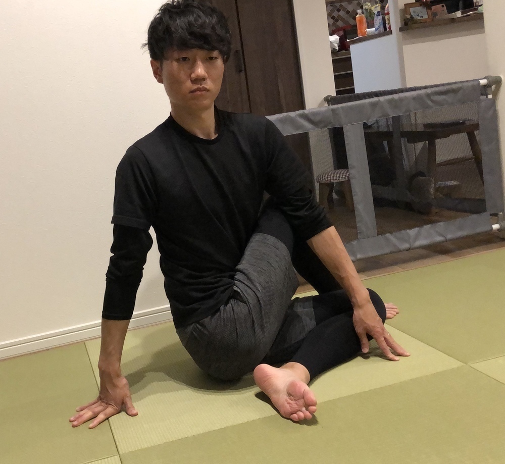 身体をひねった後、前ではなくまっすぐに身体をたおすと脊柱起立筋へのストレッチになります。こちらも試してみてくださいね。