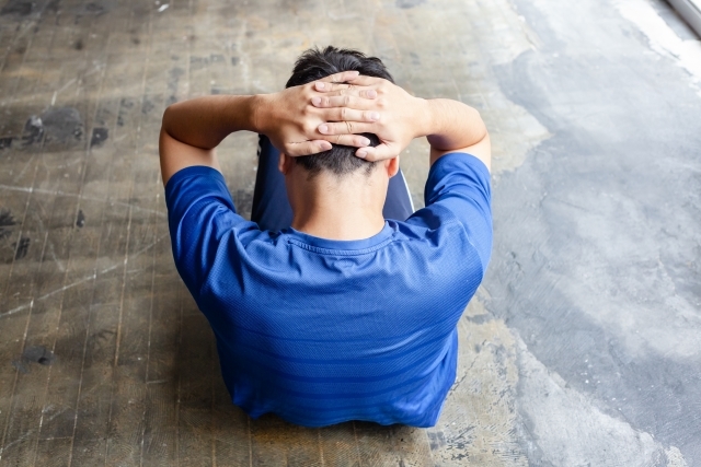 腹筋に効かないという人は背中が上まで地面についてしまっていることが多いです。この状態では腸腰筋ばかりに効いてしまいます。腹筋をしっかり働かせ、骨盤を後傾するような形で上背部・肩甲骨を浮かせる形を取ることで腹直筋を鍛えていくことができます。