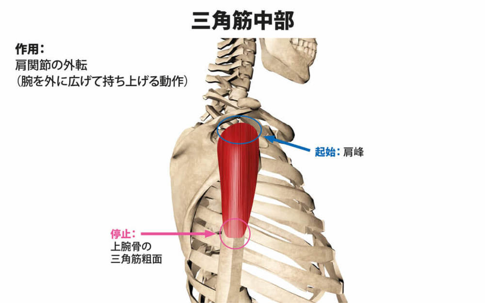 三角筋の側面にある三角筋中部は、肩峰部という名前でも呼ばれています。肩峰の外側から上腕骨外側の三角筋粗面に付着しており、前部や後部とは異なる羽状筋という構造をしています。羽状筋は腱に対して筋繊維が斜めに付着し、それぞれの筋繊維が短いことが特徴です。筋肉の可動域は狭いですが、収縮力が大きく、強い力を発揮できるというメリットがあります。