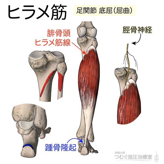 ふくらはぎにあるもうひとつの筋肉は、ヒラメ筋という名前です。先ほど解説した腓腹筋の下にあり、下腿上部から踵に付着しています。踵を引き上げる作用があるため、腓腹筋と同様に、歩く、走る、ジャンプするといった動作のときに作用します。