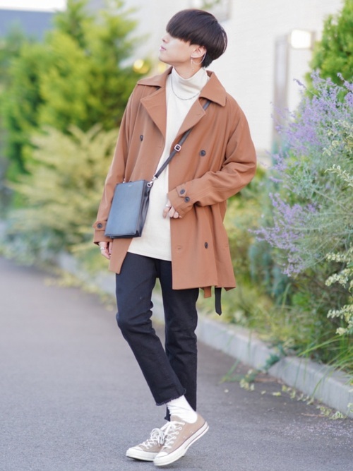 トレンチコートのインナーに白のタートルネックとデニムパンツを合わせた着こなし。コートをややショート丈にすることで、デニムパンツに似合うカジュアルな印象となっています。コートとスニーカーの色を合わせて、カラーコーディネートも意識できたコーデです。