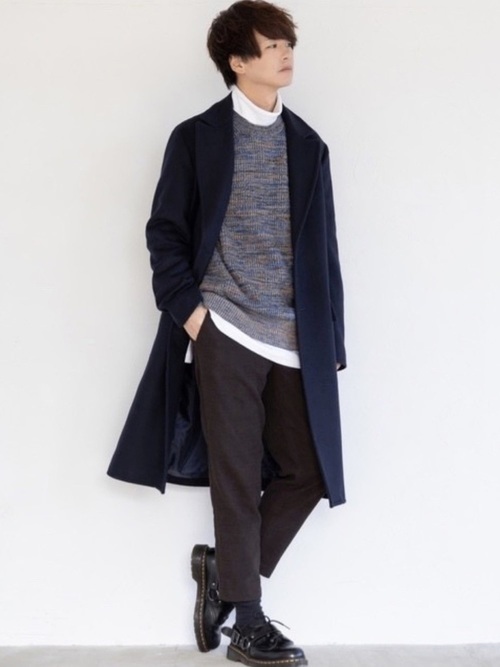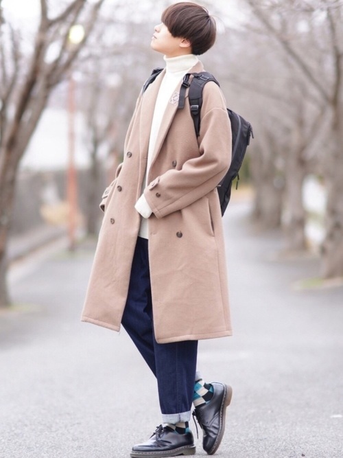 セーターのインナーに白のタートルネックを重ね着したメンズコーデです。チェスターコートとドレスシューズで上品さをプラス。インナーの白をアクセントに、全体的に落ち着いたカラーでまとめることで、大人メンズに似合う着こなしとなっています。