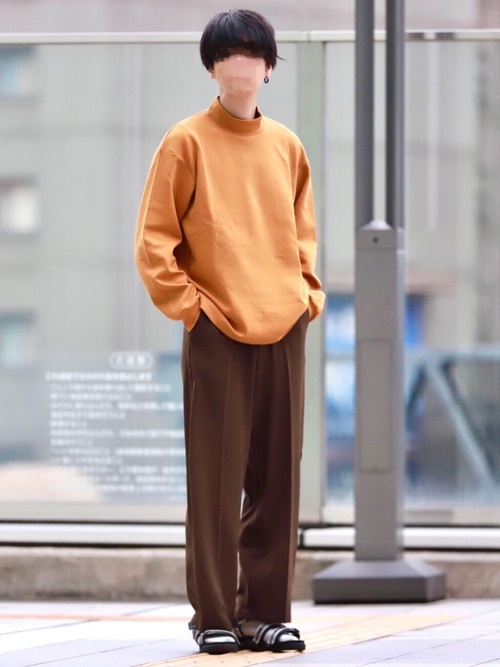 オレンジのタートルネックにブラウンのパンツを合わせた秋色メンズコーデです。タートルネックはTシャツタイプなので、寒さがまだ厳しくない日にも着用できます。寒くなってきたら、インナーを着用したり、重ね着したり、カシミヤジャケットなどのアウターを合わせたり、コーデの幅が広がるアイテムですよ。