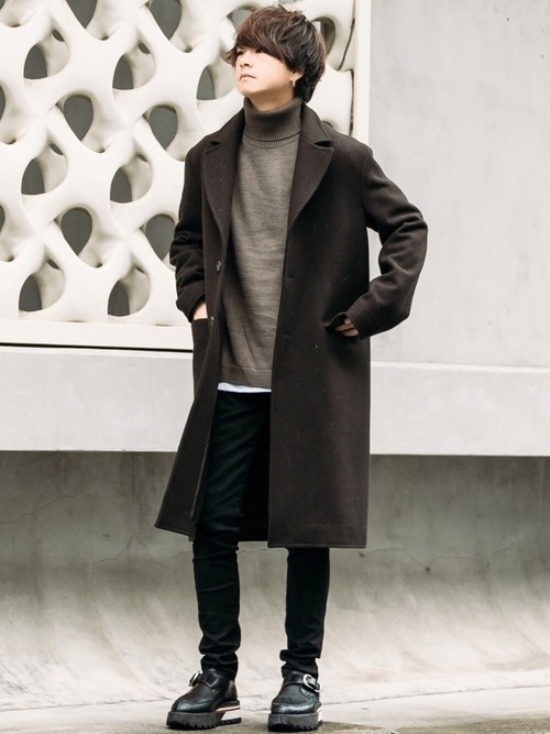 チェスターコートとタートルネックセーターをブラウンカラーに統一して、シックな大人メンズコーデに仕上げています。秋冬に似合うカラーで季節感もばっちり出すことができます。