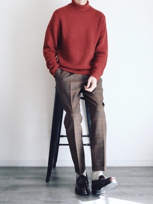 一見派手めの赤いタートルネックニットも、落ち着いた色味を選ぶことで大人メンズにフィットするカラーに。スマートなテーパードパンツとローファーを組み合わせて、品を感じる着こなしとなっています。さらに大人の品格を出したいなら、カシミヤジャケットを取り入れるのもおすすめです。