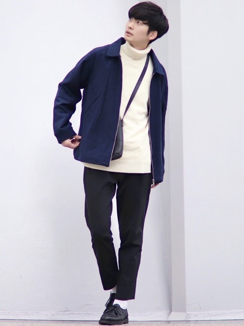 メンズファッションの人気カラーである青、白、黒を組み合わせたメンズコーデです。秋冬の季節感を出せるタートルネックセーターにブルゾンを合わせて、カジュアルな着こなしに仕上げています。